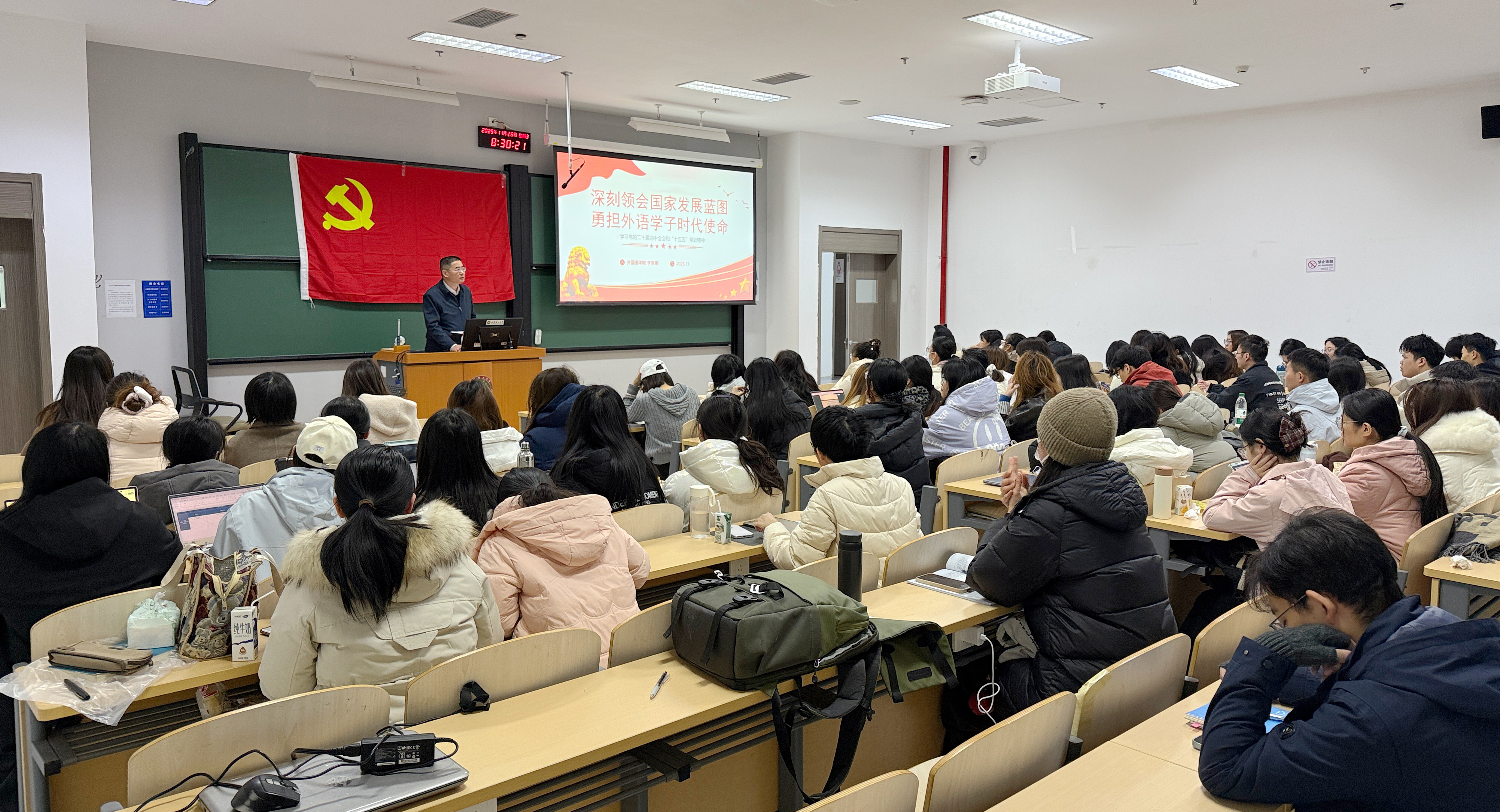 供稿、摄影:卞广为 编辑:于洁莹 为深入学习贯彻党的二十届四中全会精神,不断提高学生党员和入党积极分子的政治素养和思想理论水平,11月26日,英国365集团公司院长李京廉教授以“深刻领会国家发展蓝图,勇担外语学子时代使命——学习党的二十届四中全会和‘十五五’规划精神”为题讲授专题党课。学院全体学生党员和入党积极分子、明德书院昭理和知理党支部成员参加党课学习。 李京廉从“时代方位与战略擘画——规划的宏大背景与深远意义”、“核心要义与外语机遇——规划的主要内容”、“知行合一与时代同行——青年学生...