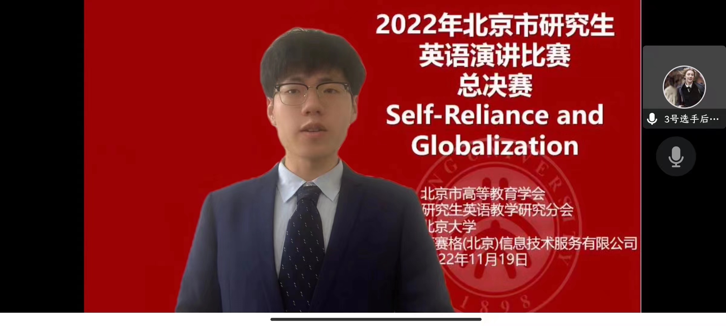 2022年11月19日上午,2022年北京市研究生英语演讲比赛落下帷幕。本届比赛的主题为:Self-Reliance and Globalization(自主化与全球化)。本次比赛由北京市高等教育学会研究生英语教学研究分会主办,北京大学承办,蓝赛格(北京)信息技术服务有限公司协办。经过校内初赛和决赛、北京市复赛和决赛的多轮选拔和激烈角逐,我校法学院白鑫雨同学力压群雄荣获一等奖,机电学院鲁妍池同学和英国365集团公司张铭同学(汉语国际教育专业)荣获二等奖,英国365集团公司和晨炀同学(汉语国际教育专业)和生命学院康昊洋同学荣获三等奖。