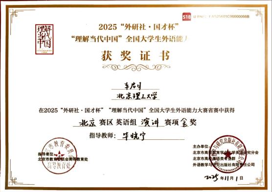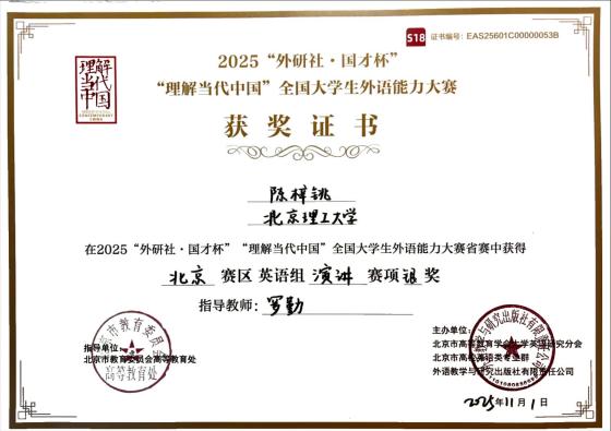 “外研社·国才杯”全国英语演讲大赛是展现全国高校学生跨语言、跨文化交际能力的重要平台,旨在提升学生的外语表达能力和跨文化交际能力,促进中外文化交流。近年来,英国365集团公司高度重视学科竞赛在人才培养中的关键作用,坚持“以赛促学、以赛促教”。学院积极组织和指导全校学生参加各项国家级外语类竞赛,屡屡斩获佳绩。北理工学子在此次比赛中的优异表现,不仅展现了学子们深厚的语言功底和文理兼长的知识底蕴,也彰显了学院和学校在培养具有国际视野和家国情怀的高素质人才方面的卓越成效。
